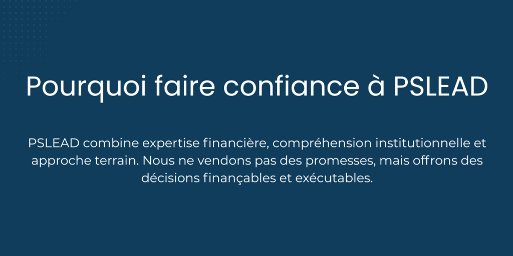 PSLEAD propose une expertise financière rigoureuse qui permet à ses clients de financer des projets crédibles, alignés sur les exigences des financeurs.